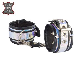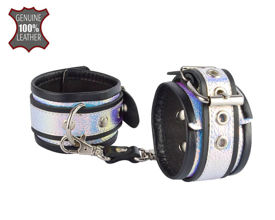 Наручники изготовлены из натуральной кожи черного цвета и представляет собой основу шириной 5,5 см, поверх которой проходит ремешок выполняющий, как декоративную функцию, так и регулировочно-фиксирующую. Особенность изделию придает голографическая отделка «хамелеон», которая переливаясь голубым, синим, бирюзовым оттенками, отражает окружающие цвета, которые дополняют девайс своими оттенками. Для комфортного ношения, край наручников обработан оторочкой, что делает их округлой формы. На ремешке располагается металлическая пряжка, при помощи которой можно подогнать изделие по размеру запястья. Соединить наручники можно при помощи карабинов, скреплённых при помощи небольшой кожаной перемычки. Вся используемая металлическая фурнитура имеет никелевое покрытие.