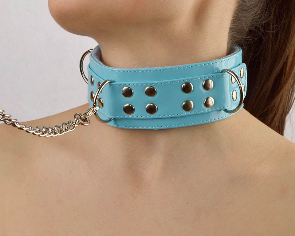 Ошейник предназначен для создания эротичного образа в ролевых играх, а также позволит управлять партнёром при помощи поводка. Ошейник изготовлен из лаковой искусственной кожи голубого цвета. В качестве подклады используется искусственный мех, мягкий и приятный на ощупь. Регулируется ошейник при помощи кнопок. Фурнитура имеет никелевое покрытие. В комплекте с ошейником идет поводок в виде цепочки с карабином и петлёй из искусственной кожи, для запястья. Длина поводкма-цепочки составляет около 1 м.