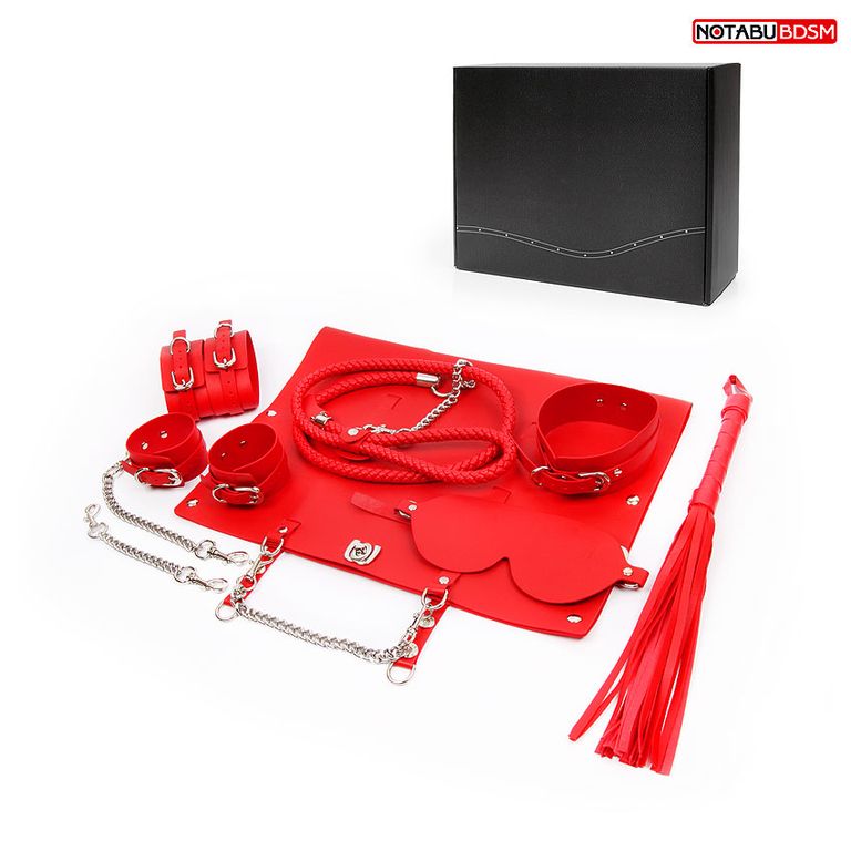 Великолепный набор аксессуаров для любителей БДСМ-игр. В комплект входят маска, фиксатор, ошейник с плетённым поводком, наручники, оковы, плеть.