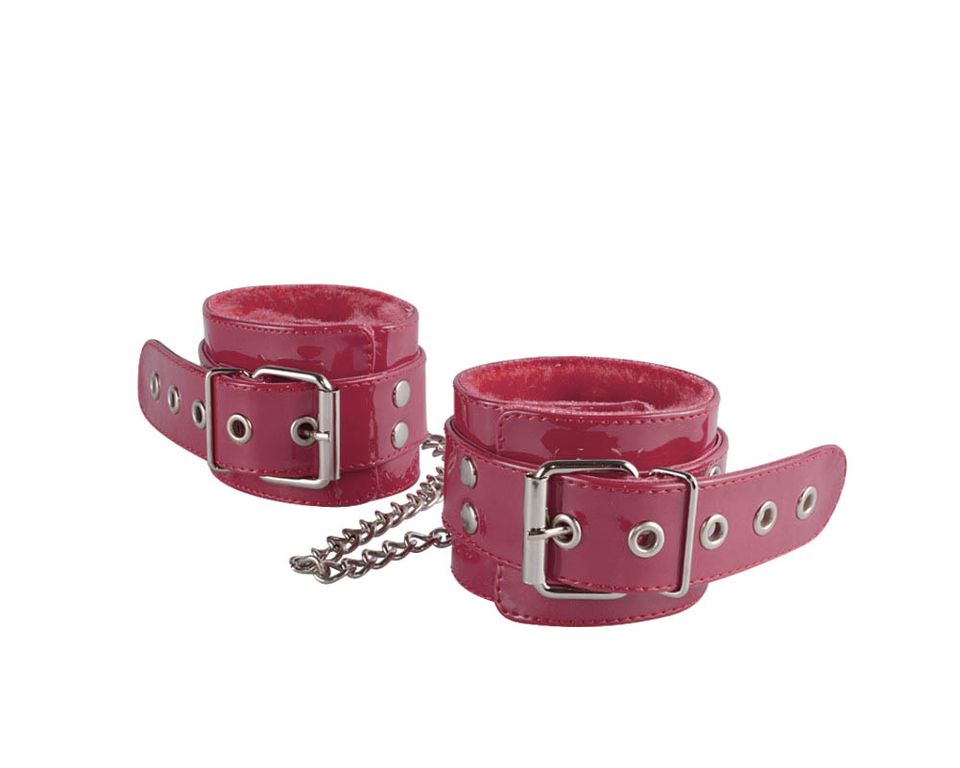 Яркие оковы из искусственной лаковой кожи вишневого цвета. Внутренняя сторона изделия отделана мягким искусственным мехом. Соединяются оковы при помощи 20 см цепочки с двумя карабинами. Длина наручника 35 см, ширина 6,0 см.