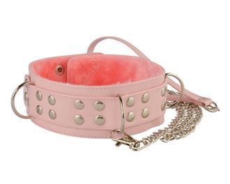 Ошейник предназначен для создания эротичного образа в ролевых играх, а также позволит управлять партнёром при помощи поводка. Ошейник изготовлен из лаковой искусственной кожи розового оттенка. В качестве подклады используется искусственный мех, мягкий и приятный на ощупь. Регулируется ошейник при помощи кнопок. Фурнитура имеет никелевое покрытие. В комплекте с ошейником идет поводок в виде цепочки с карабином и петлёй из искусственной кожи, для запястья. Длина поводка-цепочки 1 м.