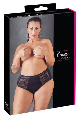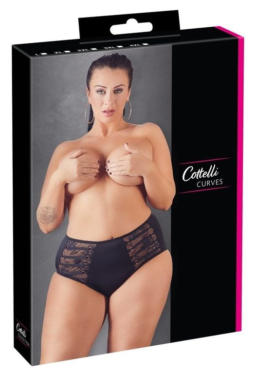 Черные трусики с кружевными вставками спереди и деталями в виде колец цвета розового золота.