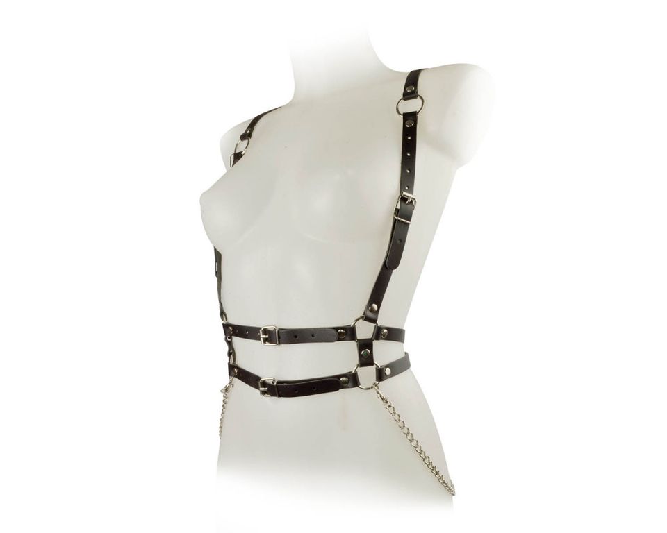 Кожаная портупея мягко оковывает женскую фигуру, придавая уверенности и привлекательности женскому образу. Никелированная фурнитура легко и надёжно зафиксирует портупею на фигуре. Никелированные цепочки в контрасте с чёрной кожей, непременно привлекут к Вам внимание.
