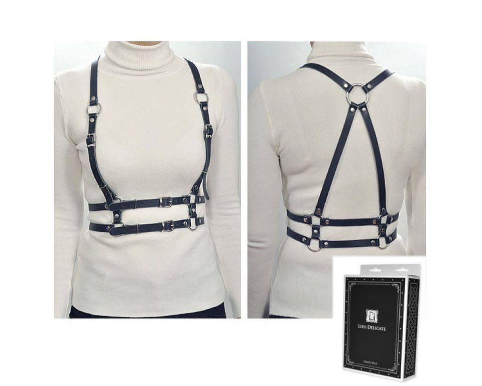 Портупея из натуральной кожи черного цвета с никелированной фурнитурой, беспроигрышный вариант, для придания образу провокационности и сексуальности. Она добавит изюминку к большинству обычных нарядов.